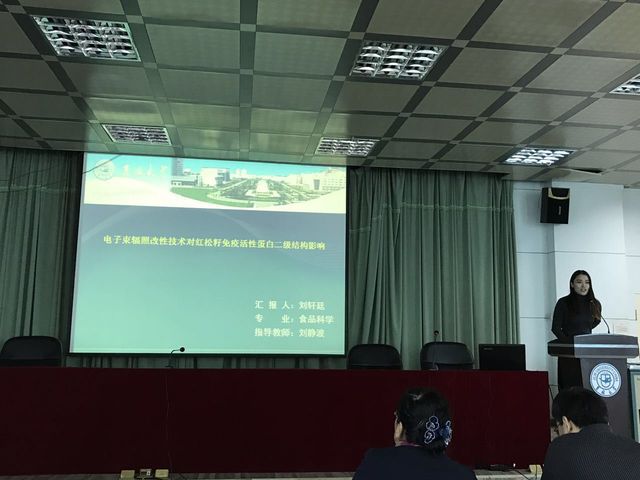 刘静波教授、周亚军教授和孙春燕教授担任专家评委。上午,首先由两位青年教师经过精心准备对自己从事的科研课题进行介绍,张婷老师报告了食源性生物活性肽对血管紧张素转化酶的抑制作用研究,赵昌辉教师报告了SBP1的丢失会降低细胞对DNA断裂剂的敏感性和细胞硒含量方面的研究。之后,研究生杨帅伶、史册、刘鑫、刘轩廷、陈冬妍、王洪美、陈玲分别展示了自己现阶段的研究成果,同时报告人、评审人及同学们进行了三方互动交流,内容涵盖基于动态蒸汽吸附及低场核磁共振技术对蛋清肽粉的水分吸附动力学及其动态分布、尼生素协同肉桂醛抗金黄色葡萄球菌、基于三螺旋DNA分子开关检测啶虫脒、非热改性技术对红松子蛋白免疫活性及二级结构的影响、油炸条件对三种薯类中呋喃形成的比较、基于离散元和传感器阵列的牛肉品质快速检测、乳酸菌对人参皂苷的生物转化等以食品科学与食品安全为主的学科交叉研究内容。下午,国产自拍