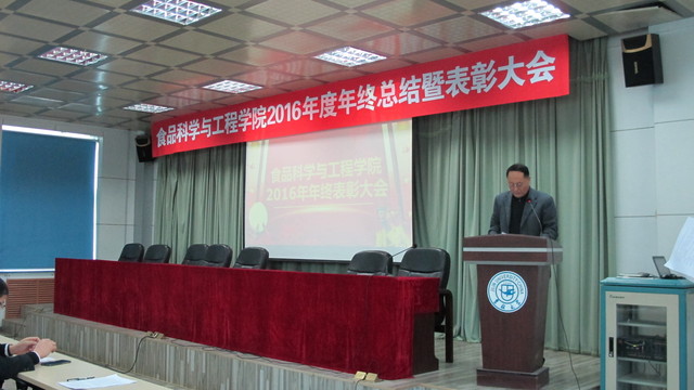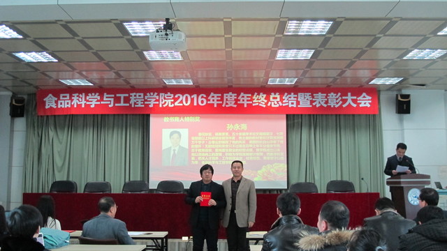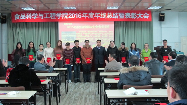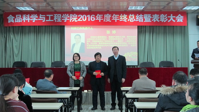 关于表彰2016年度先进单位和个人的通报,副院长张铁华同志宣读了关于2016年食品科技青年论坛获奖情况的通报,院长助理兼食品科学与工程系主任周亚军同志宣读了关于2016年本科生学术年会获奖情况的通报;会上对一年来表现突出的单位、教师和学生进行了表彰。