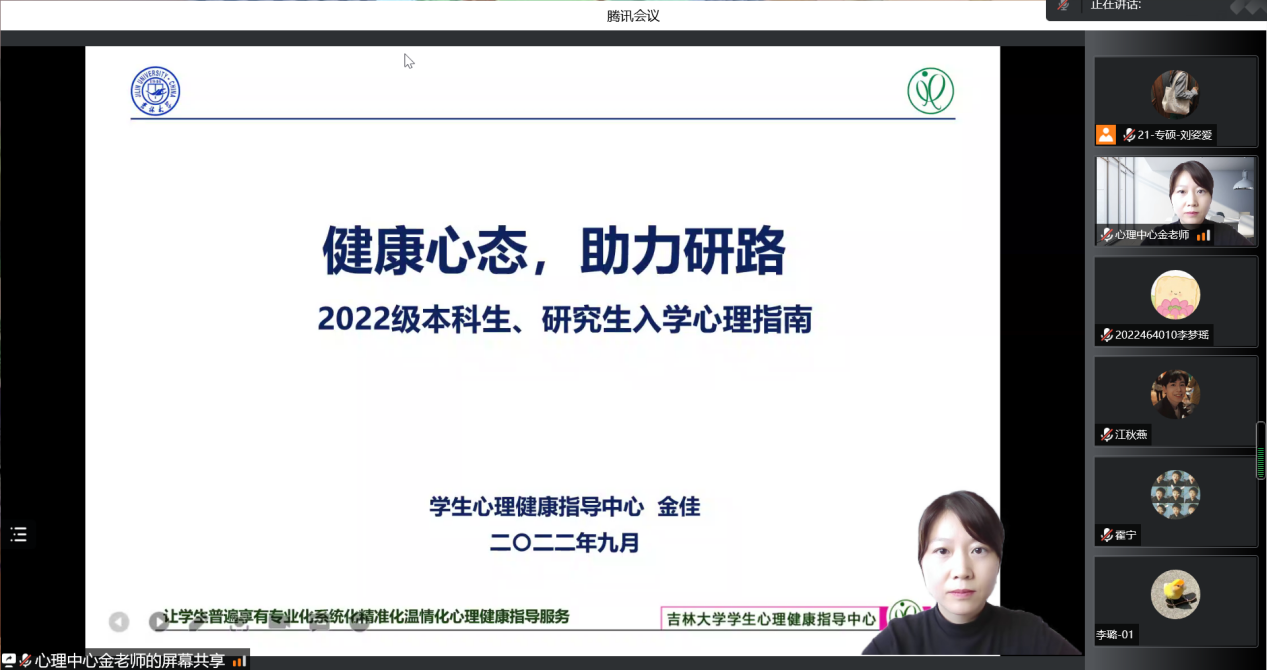 特邀心理健康指导中心金佳老师,为2022级研究生新生作一场以“健康心态,助力研路”为主题的线上讲座,讲座由国产自拍