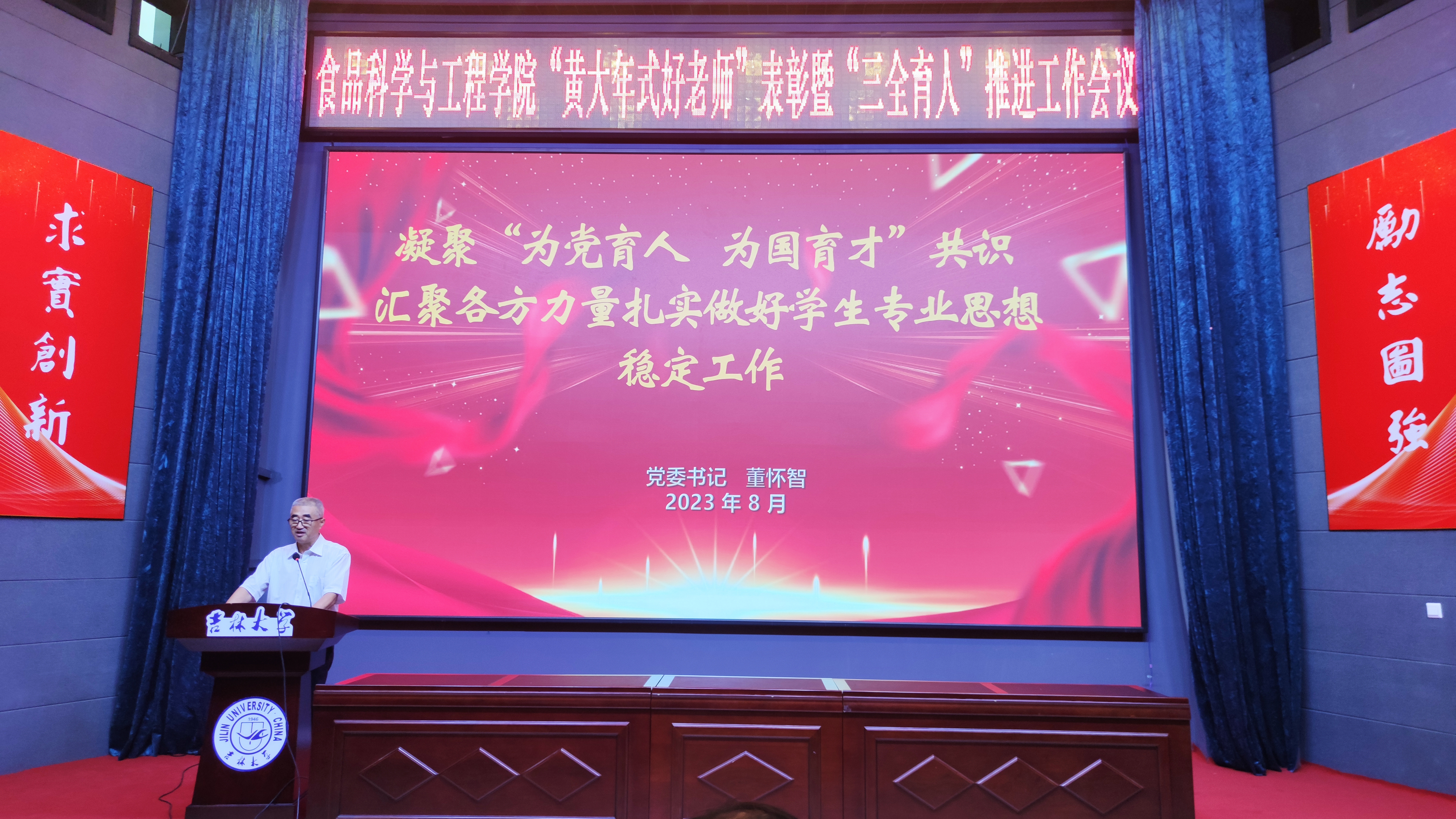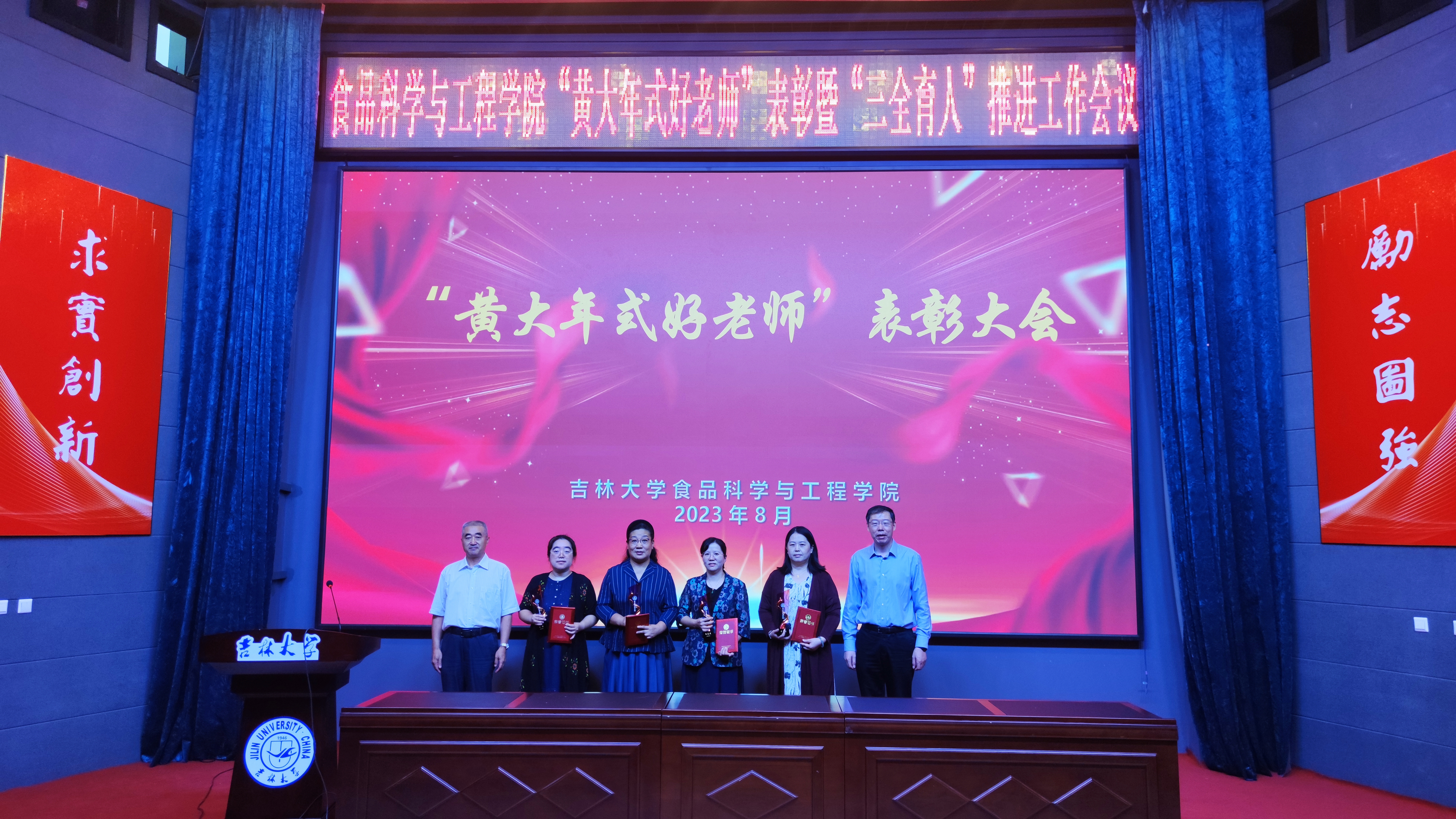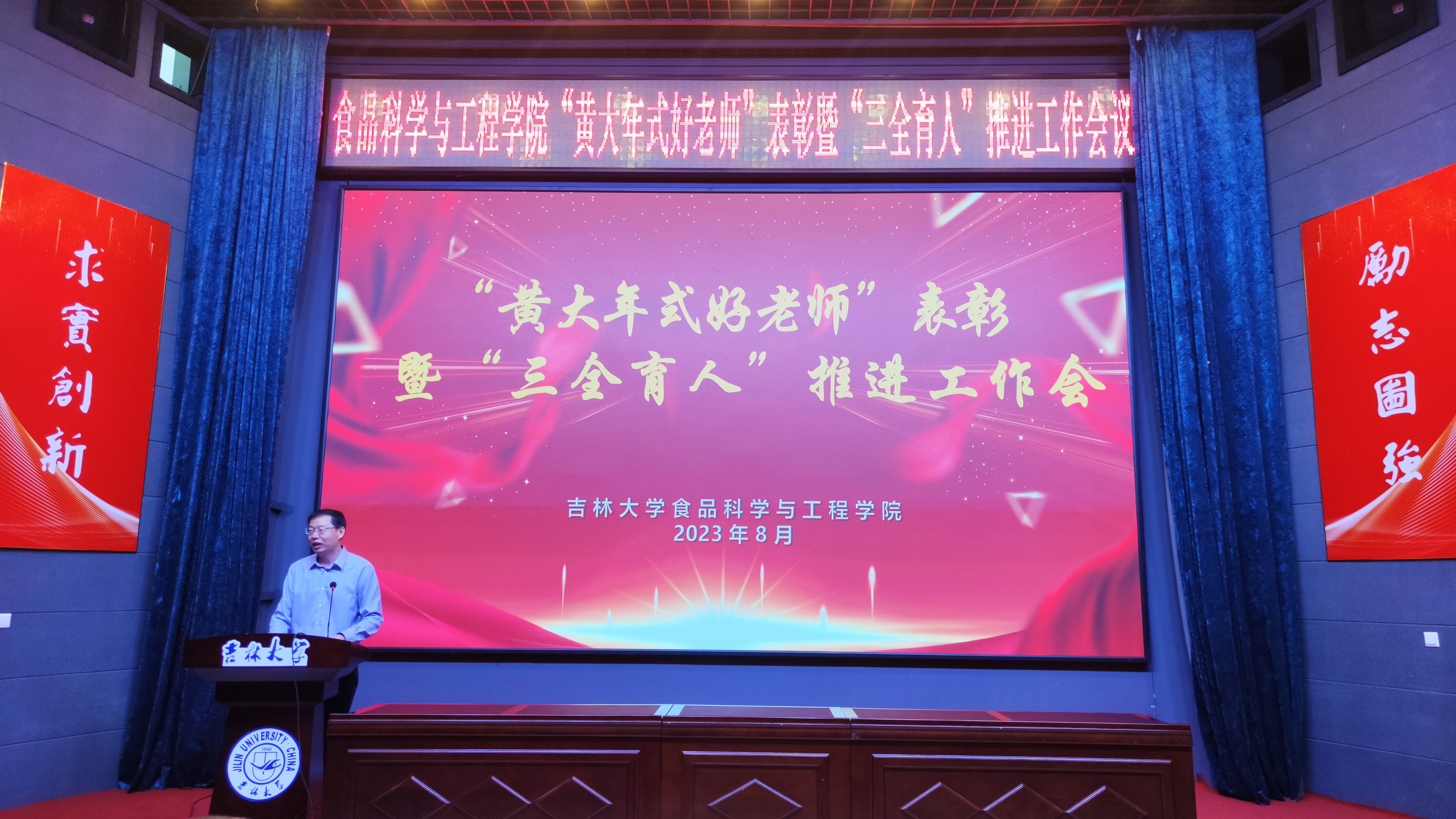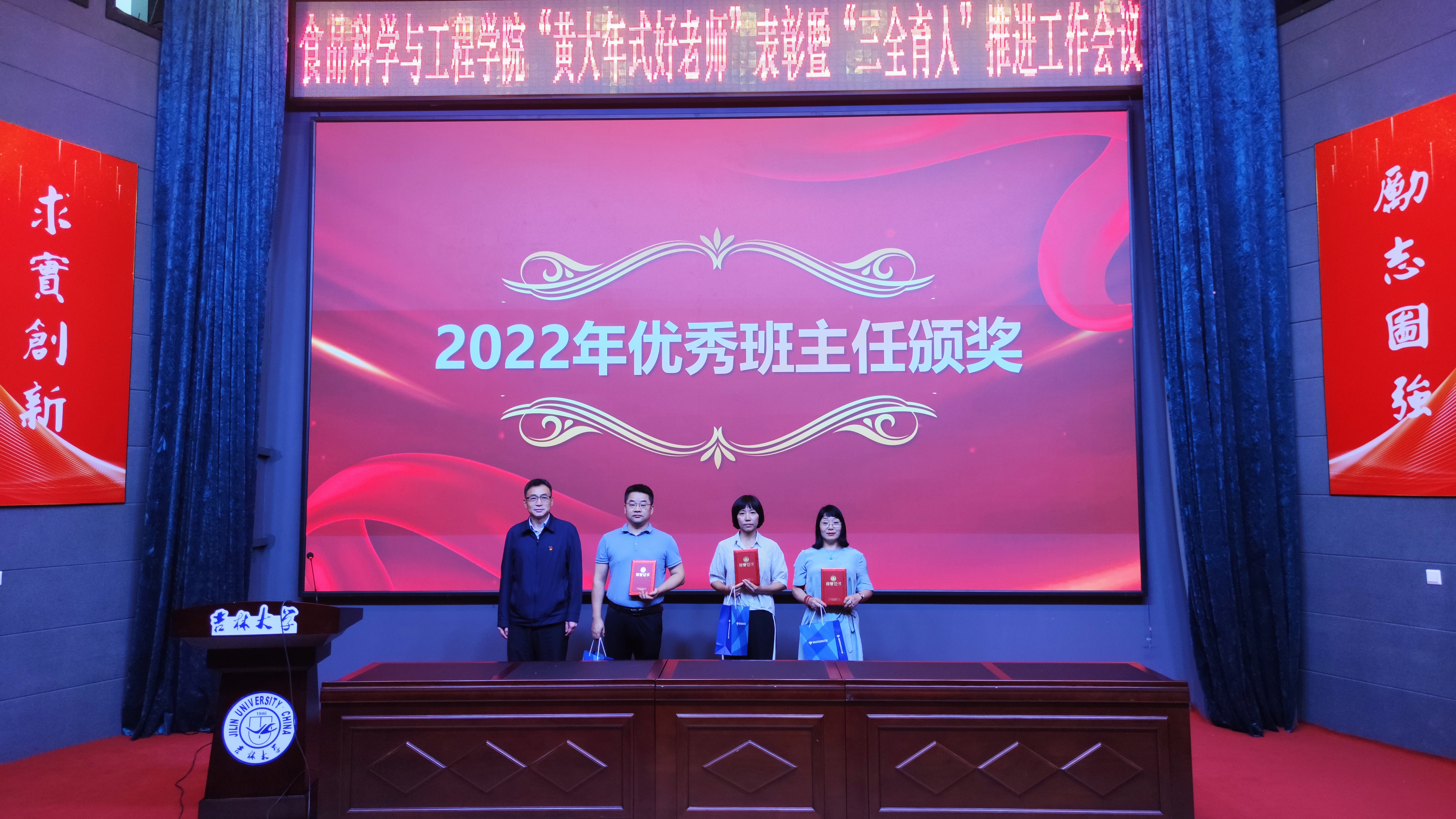 课程思政建设指导纲要》主要精神,并为教师代表颁发了《食品科学与工程类课程思政案例指南》书籍;党委副书记李超宣读了《2022年优秀班主任获奖名单及2023 级新生班主任聘任名单》;副院长陈玉江为荣获优秀班主任荣誉的李欣欣、董周永、卢静等3位老师颁发了证书及纪念品,副院长周亚军为2023 级新生班主任颁发了聘书。