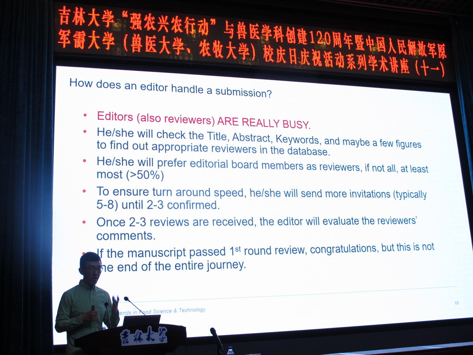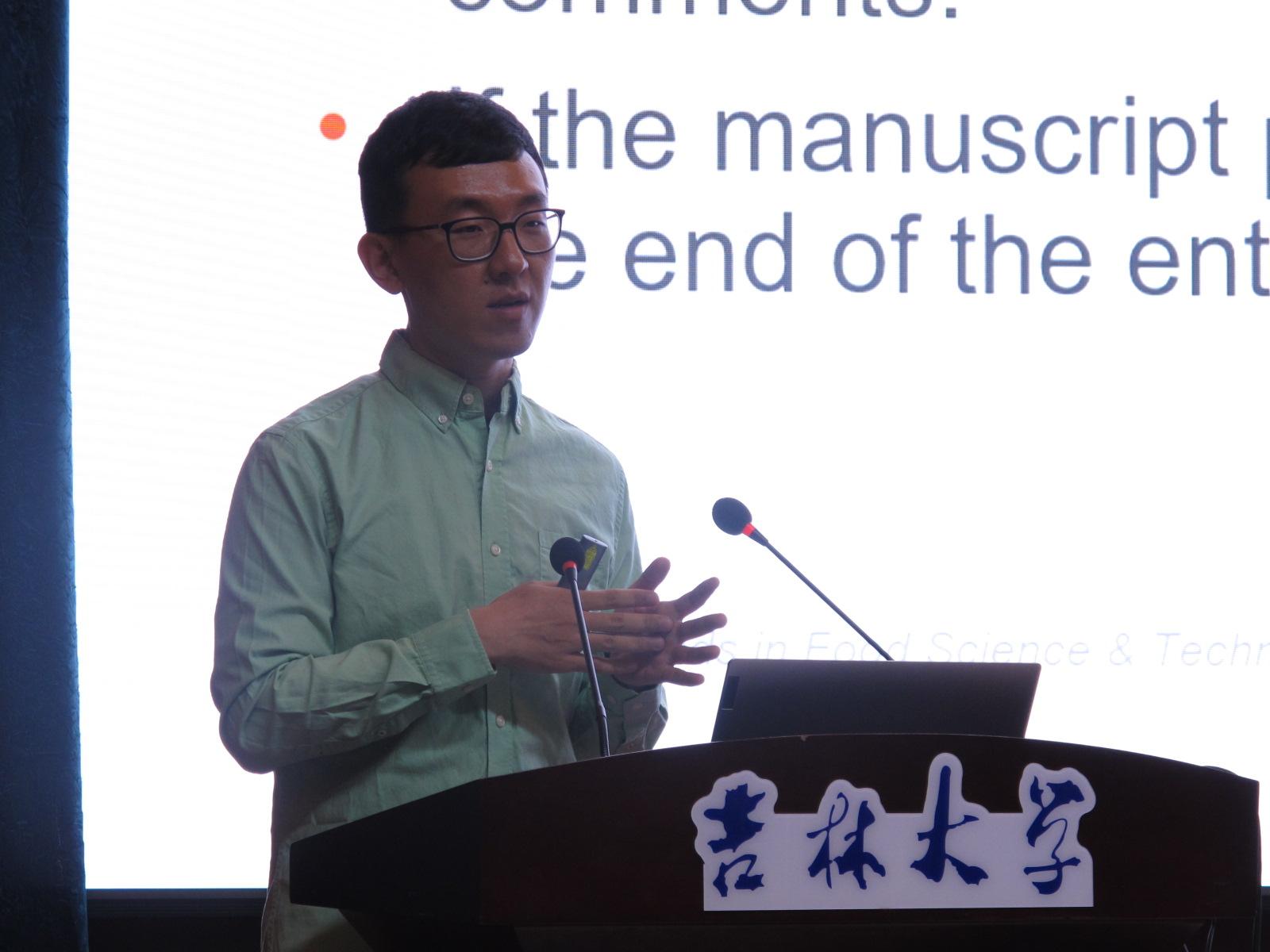 此次讲座,陆晓楠教授主要围绕弯曲杆菌及其与农业生态系统相互作用、农业食品环境中检测弯曲杆菌的先进方法进行介绍,并总结其在农业食品系统中的流行情况及其特征以及弯曲杆菌的新防治策略。作为《Trends in Food Science & Technology》期刊的编辑,陆教授详细介绍了该期刊的基本信息,以及如何在该刊上发表学术论文。他从编辑的角度对文章受理投稿全流程及注意事项等进行了系统深入地讲解,并以学者和导师身份向同学们分享了宝贵的论文写作经验。