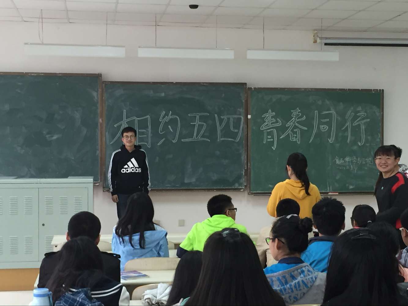 2015级食科3班于吉林大学前卫南区李四光楼展开了“相约五四,青春同行”主题班会。 班会上,班长首先借助多媒体向大家介绍五四运动与五四精神,调动起同学们的积极性。随后,在班委的组织下,同学们分小组讨论,并轮流上台演讲,发表对五四精神的认识以及作为青年大学生自身所具有的觉悟。最后,团支书带领全班同学合唱共青团团歌,班会在激昂的歌声中结束。 通过此次班会,同学们深刻理解到作为当代青年,一要关心国家大事,正确分析形势,明确自己的历史责任;二要以“国家兴亡,匹夫有责”作为自己学习、工作的指针,全面提高自己思想道德素质和人文科学素质,努力学会学习、协作、生存、竞争,三要在社会文明和进步中努力发挥高中生青春朝气和示范作用。此次活动激发了同学们的爱国主义热情以及民族责任感,强化同学们的责任意识、爱国意识,相信同学们在以后的学习中,将端正自身的思想态度,将来能为祖国的繁荣昌盛贡献出自己的力量。