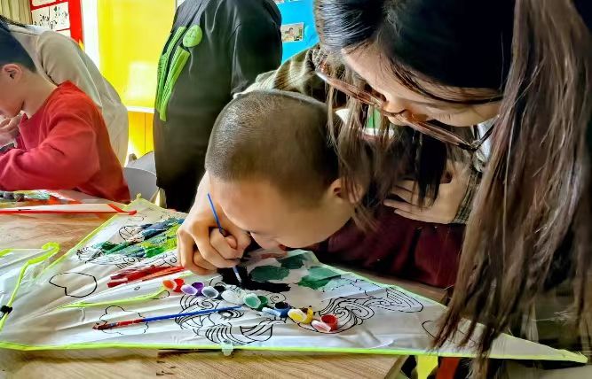 的学生志愿者于2024年4月14日来到长春市宽城区“与光同行”特殊儿童训练中心,和“与光同行”的自闭症儿童们一起绘制风筝、放飞风筝。