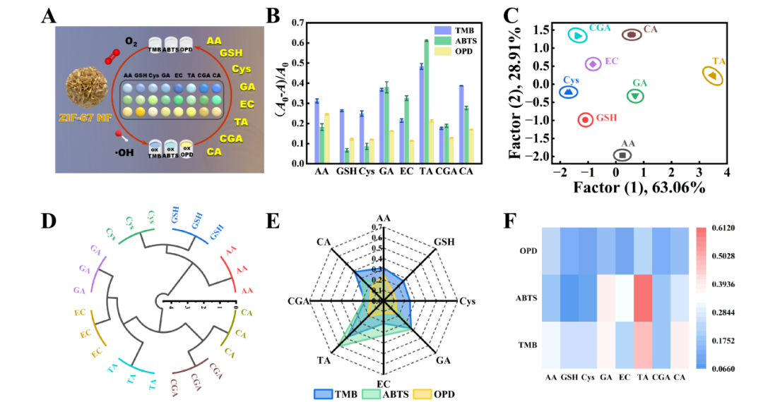 金属有机框架(MOFs)的可设计形态和可预测性质是材料工程中的重要问题。该研究通过巧妙调控金属钴离子(Co2+)与有机配体(2-甲基咪唑)的前驱体比例,实现ZIF-67从经典十二面体向具有丰富层次孔结构的纳米花的可控转变。ZIF-67 纳米花(ZIF-67 NF)不仅保留了POD活性,更首次展现出显著的OXD活性,并成功构建了基于此的三通道比色传感器阵列,实现了对8种常见抗氧化剂的高效、高灵敏、高选择性识别与检测。
