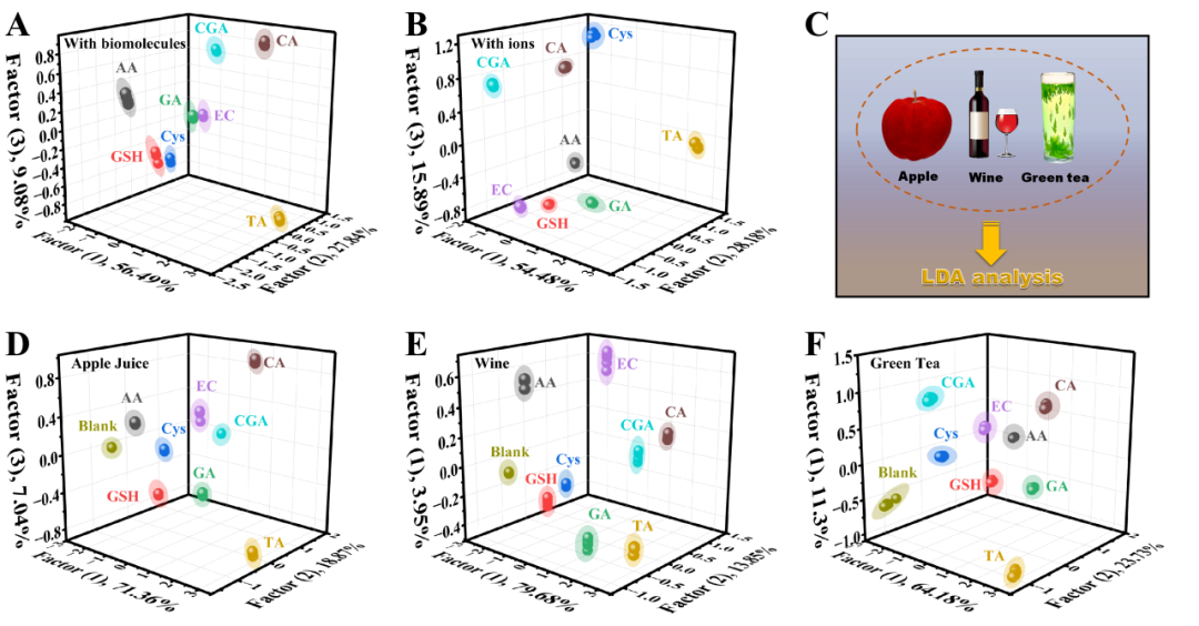 最后,为了评估这种比色传感器阵列的应用可行性,该团队研究了其在常见生物分子和离子存在的情况下区分抗氧化剂的能力(图7)。结果表明,即使在含有干扰物质的复杂样品中,这种比色传感器阵列也能够准确识别八种抗氧化剂。不仅如此,该工作使用苹果汁、葡萄酒和绿茶评估了传感器阵列的比色响应,证明所构建的比色传感器阵列对复杂实际样品中的八种抗氧化剂具有出色的识别能力。