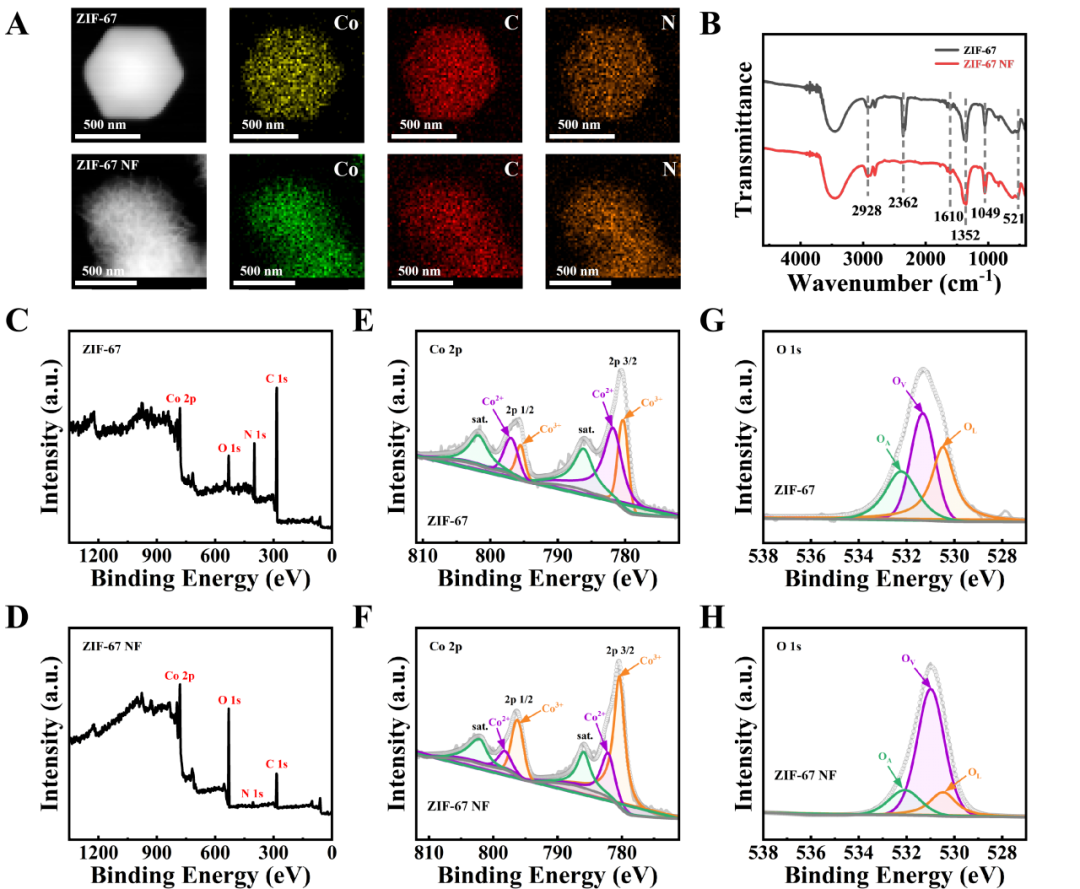 接下来,为了对比这两种材料的结构特性,该研究团队采用Mapping(图3A)、FTIR(图3B)、XPS等手段对其进行了进一步表征。BET研究发现,ZIF-67 NF的比表面积要低得多(91.09 m2/g)。然而,它形成了具有微孔、介孔和大孔的三模式层状多孔微观结构。这些介孔和大孔有效地缩短了反应物的扩散路径,减轻了传质阻力,促进了基质物质的传输,并增加了活性位点的暴露,从而提高了催化效率。XPS表征表明(图3C-H),ZIF-67 NF中钴物种的价态升高,且存在更多的氧空位。根据Sabatier原理,高价态钴的d带电子填充减少,导致d带中心向费米能级靠近,从而增强了反应中间体的吸附。样品中的氧空位可增加其附近的电子密度,形成路易斯碱位点,促进氧化物的吸附和活化,从而提高催化活性。它们的共同作用降低了反应的活化能,使得ZIF-67 NF的催化活性高于ZIF-67十二面体。