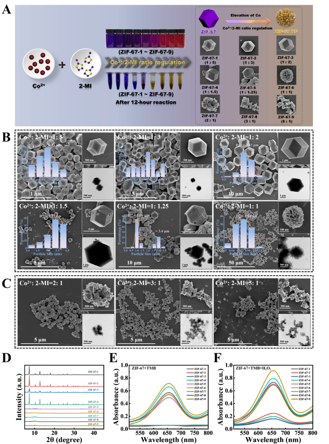 首先,该研究团队采用简单的共沉淀法,在甲醇中以不同比例混合Co(NO3)2·6H2O和2甲基咪唑,成功合成了九种不同前驱体浓度比(Co2+:2-MI=1:5, 1:3, 1:2, 1:1.5, 1:1.25, 1:1, 2:1, 3:1, 5:1)的ZIF-67-(1-9)(图2A)。通过扫描电子显微镜(SEM)、透射电子显微镜(TEM)和X射线衍射(XRD)对合成产物的形貌和结构进行了表征(图2B-D),合成产物呈现出从十二面体逐渐转变为纳米花的趋势。在这个过程中,大量成核位点迅速出现,使得晶体在生长过程中相互竞争,阻碍了其在各个方向的均匀生长,这种非均匀生长最终导致晶体形态的改变,并逐渐过渡到纳米花结构。此外,除了ZIF-67十二面体和ZIF-67 NF共有的类过氧化物酶活性外(图2E),ZIF-67 NF 还表现出类氧化酶活性(图2F)。