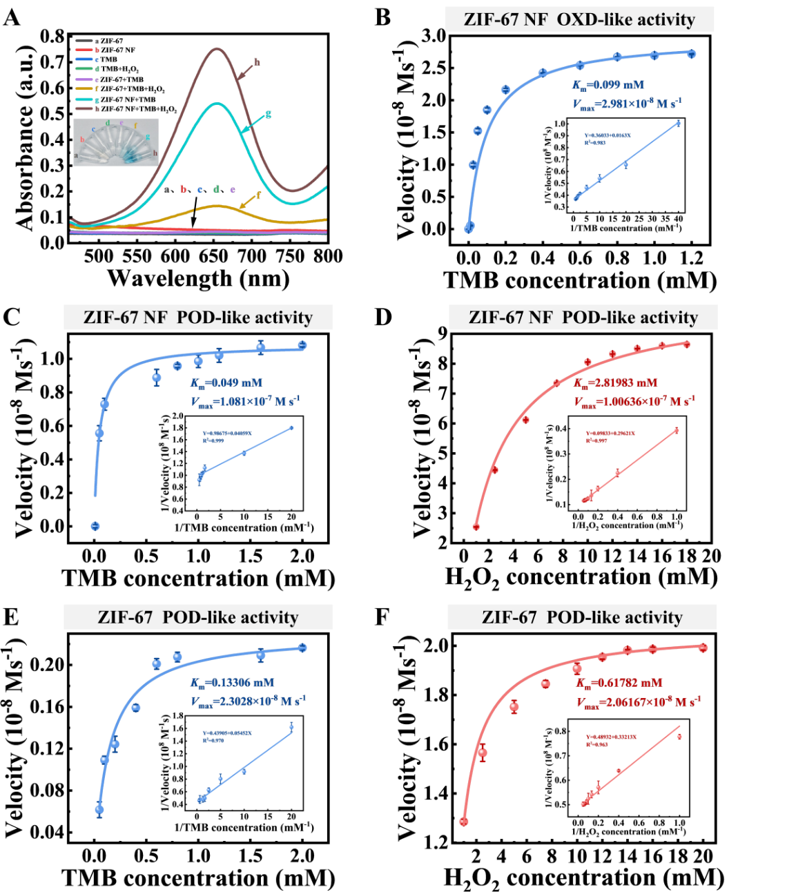 为了进一步研究两种形态的ZIF-67的催化性能,该研究团队分别分析了ZIF-67 NF和ZIF-67十二面体的酶动力学,并绘制反应速度与TMB和H2O2浓度的关系(图4),用于计算Km和Vmax。当研究ZIF-67 NF的类氧化酶动力学时,TMB为底物的Km和Vmax分别为0.099 mM和2.981×10-⁸ M s-1;当研究ZIF-67 NF的类过氧化物酶活性时,TMB的Km和Vmax分别为0.049 mM和1.081×10-7 M s-1,H2O2的Km和Vmax分别为2.82 mM和1.006×10-7 M s-1。同样,ZIF-67 十二面体以TMB为底物的Km和Vmax分别为0.133 mM和2.303×10-⁸ M s-1;以H2O2为底物的Km和Vmax分别为0.618 mM和2.062×10-⁸ M s-1。