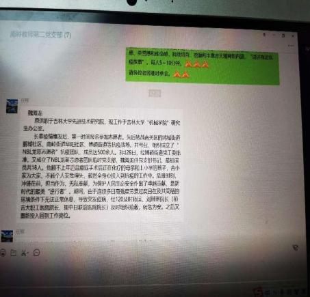 陈艳等老师、学生及其家人的防疫故事,王笑丹老师分享的本班学生张凤兰做志愿者的收获,董周永老师分享的家人“大白”、身边同校老师的故事等等,这些故事都充分体现出:在国家遇见困难的时候,党员起到了先锋模范作用,党支部起到了战斗堡垒作用,只要大家团结一心,齐心协力,互相帮助和互相鼓励,就一定能战胜一切困难,迎来春暖花开之时。通过故事的分享和交流,更提升了支部党员对黄大年精神的理解和感悟,强化了支部党员的凝聚力和战斗力。