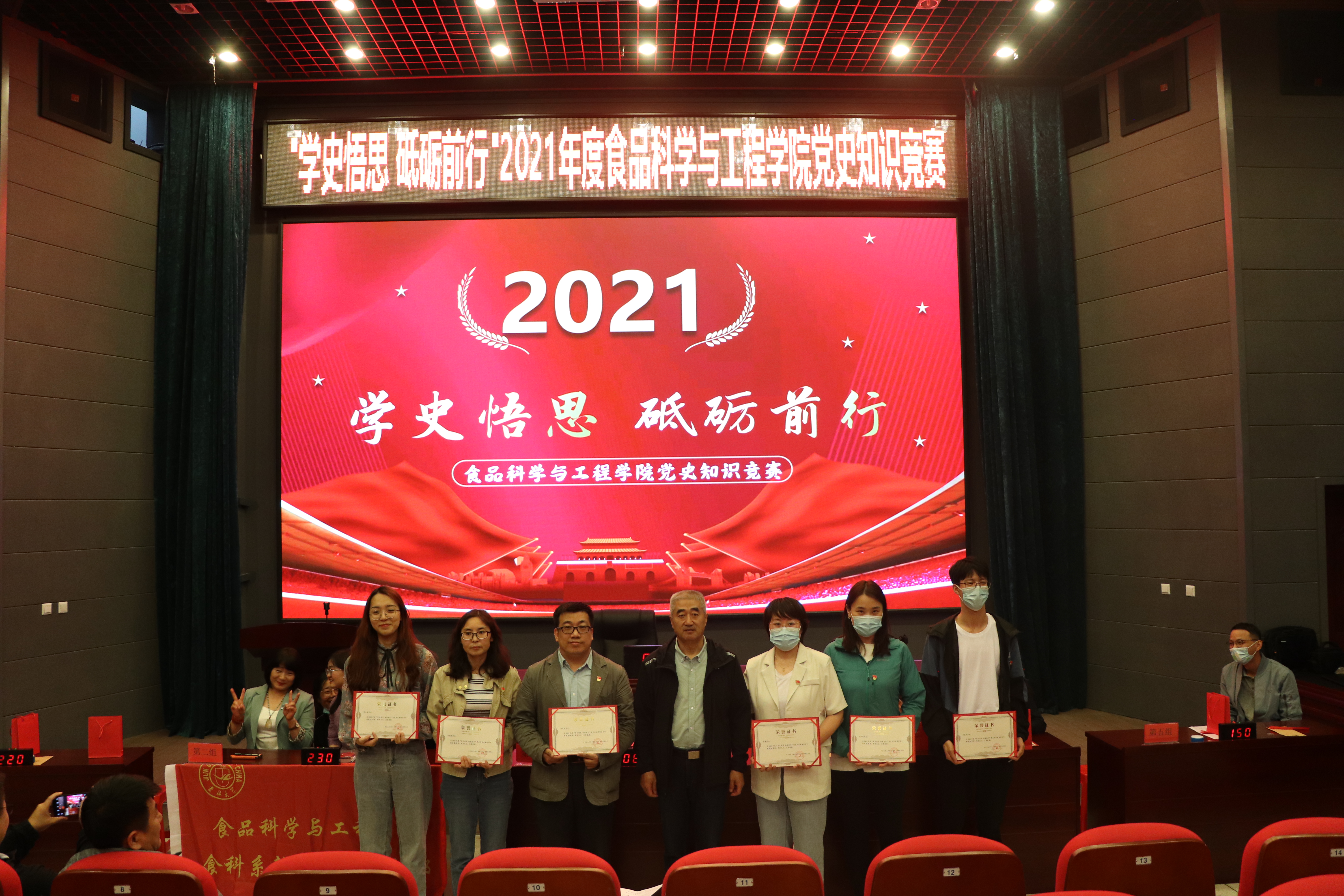 师生党员联合组成五支代表队参赛,知识竞赛有必答题、抢答题、风险题等环节,涵盖《中国共产党章程》《党的十九大报告》、党建知识应知应会100题等党史相关内容。主持人宣布竞赛开始后,全体师生党员齐唱《中华人民共和国国歌》,比赛帷幕就此拉开。比赛中,选手们精神饱满,积极踊跃,沉着应答,展现出丰富的党史知识储备。在抢答题环节,各参赛队选手争分夺秒,精彩迭出,赢得了一阵阵热烈的掌声。比赛现场气氛热烈、紧张有序、扣人心弦,经过激烈角逐,食品科学与工程系第二教师党支部代表队荣获一等奖,食品科学与工程系第一教师党支部和实验教学中心党支部代表队荣获二等奖,食品质量与安全系教师党支部和机关党支部代表队荣获三等奖。
