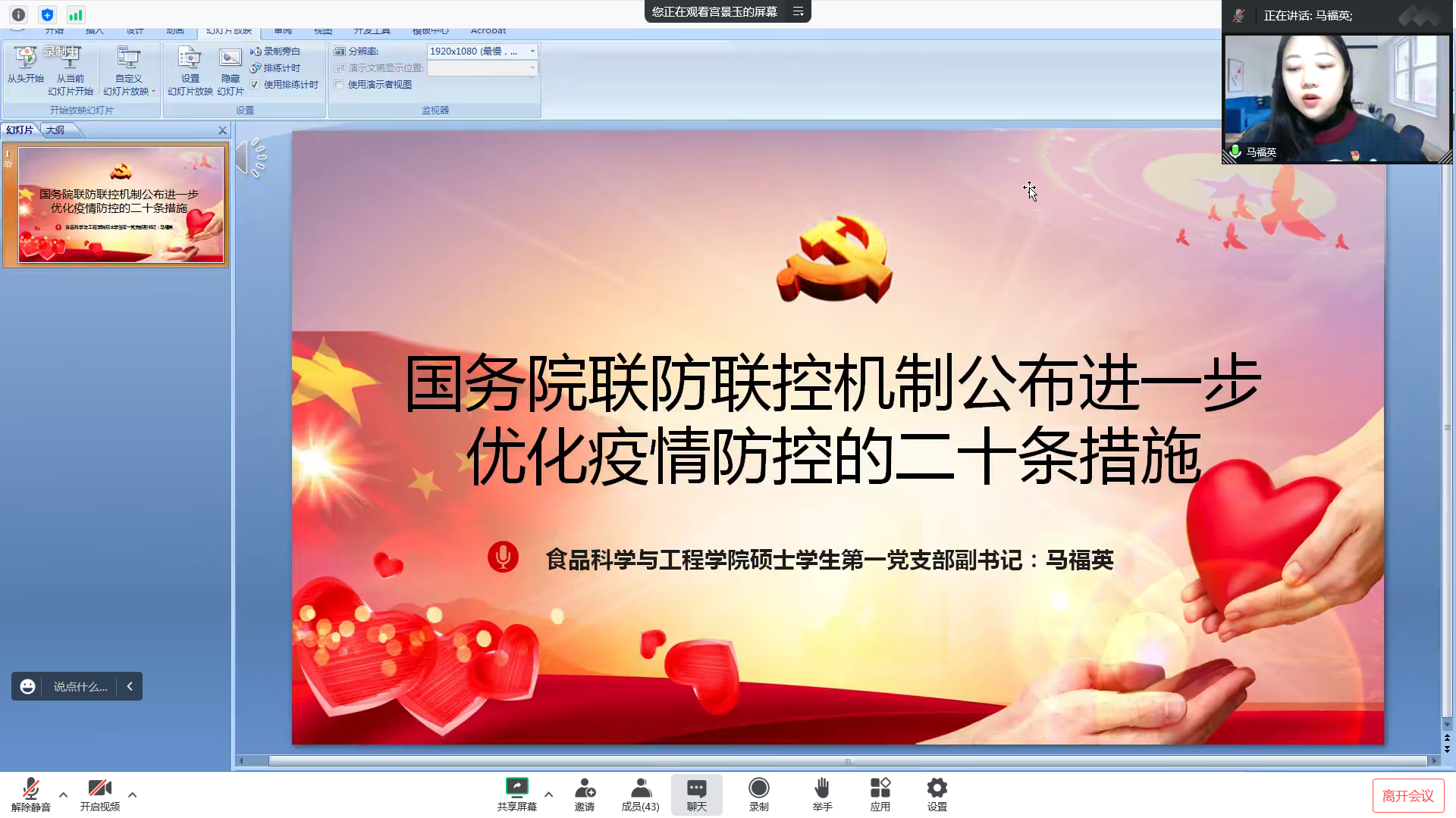 紧接着,由支部副书记马福英带领与会人员集体学习国务院公布的“进一步优化疫情防控工作二十条措施”内容。马福英同志指出,二十条优化措施充分彰显了“坚持人民至上、生命至上”的疫情防控指导思想,是统筹疫情防控和经济社会发展的重大积极成果。与此同时,各位党员同志要充分认识抗疫斗争的复杂性、艰巨性、反复性,坚定不移贯彻“动态清零”总方针,积极配合国产自拍 相关防疫工作安排,积极参与国产自拍 防疫志愿工作,发挥党员先锋模范作用。