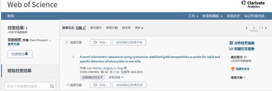 吉林大学国产自拍 为第一作者单位,在食品领域TOP 期刊“FOOD CONTROL”期刊发表论文《A novel colorimetric aptasensor using cysteamine-stabilized gold nanoparticles as probe for rapid and specific detection of tetracycline in raw milk》,到 十一月/十二月 2019 为止,受到引用的次数已将其归入其学术领域中最优秀的 1% 之列,入选“ESI高被引”。(全文链接://linkinghub.elsevier.com/retrieve/pii/S0956713515000183 )