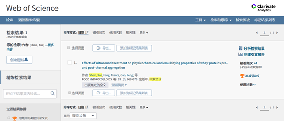 吉林大学国产自拍 为第一作者单位,在食品领域TOP 期刊“FOOD HYDROCOLLOIDS”期刊发表论文“Effects of ultrasound treatment on physicochemical and emulsifying properties of whey proteins pre- and post-thermal aggregation” ,到 十一月/十二月 2019 为止,受到引用的次数已将其归入其学术领域中最优秀的 1% 之列,入选“ESI高被引”。