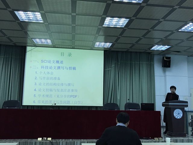 邀请SCI发表有经验的教师作专题报告。孙春燕教授用了两个半小时系统地介绍了SCI入门、查阅文献、试验、撰写、投稿等主要内容。黄卉副教授结合自身撰写SCI论文经验,重点介绍了一个学术工作的产生流程,并强调了团队合作的重要性。四个半小时的无私分享,同学们听得聚精会神,这会让同学们少走许多弯路,提供了有益的启示,也振奋鼓舞了人心。
