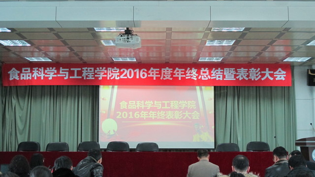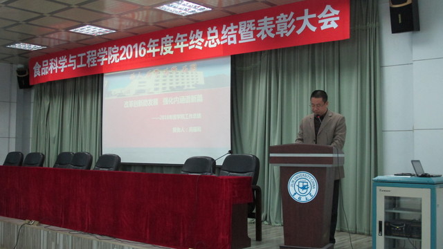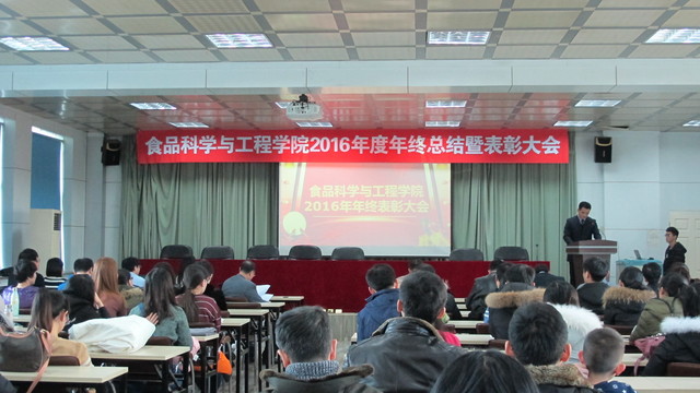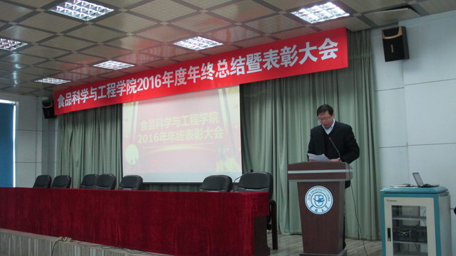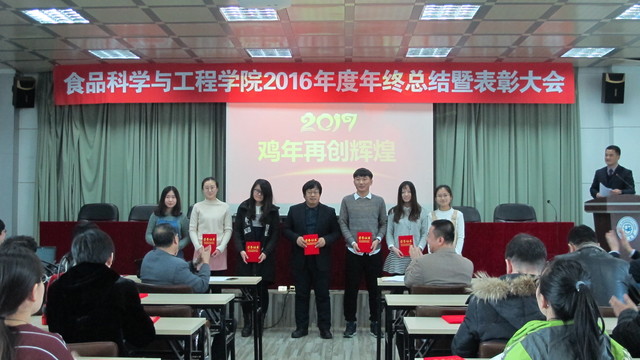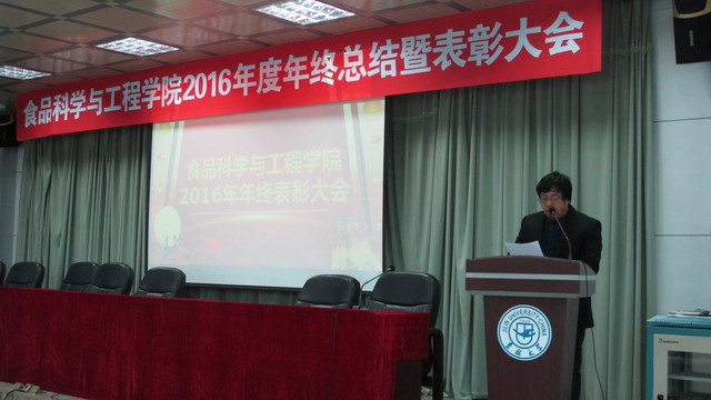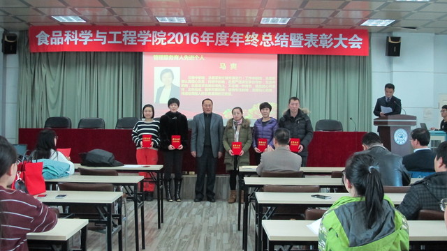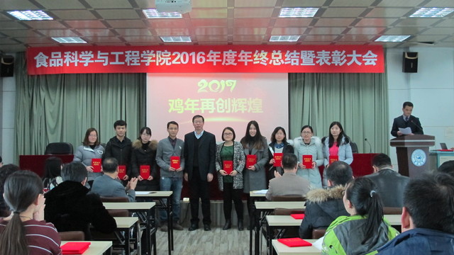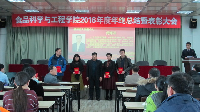 关于表彰2016年度先进单位和个人的通报,副院长张铁华同志宣读了关于2016年食品科技青年论坛获奖情况的通报,院长助理兼食品科学与工程系主任周亚军同志宣读了关于2016年本科生学术年会获奖情况的通报;会上对一年来表现突出的单位、教师和学生进行了表彰。