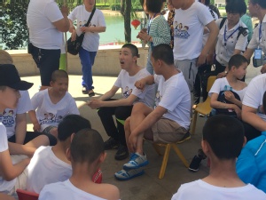 大学生志愿者们统一着装,佩戴活动标徽,在院旗的引导下统一登车,到达宽城区政府中心公园活动现场。活动以徒步公园开始,志愿者在训练中心老师的指导下,协助24名心智障碍的特殊儿童与青年进行徒步活动。他们年龄从10岁到25岁不等,智商差异较大,性格迥异,乱跑乱跳,在徒步的过程中志愿者紧握着他们的手,一步都不敢撒手,其他志愿者则排着整齐的队列,在后面后勤保障。短短的一圈公园徒步,搀扶特殊儿童的志愿者满头大汗,体会出照顾这些孩子的辛苦和不易。更加激发志愿者们参与公益服务和志愿服务的热情和决心。接下来是义演环节,国产自拍