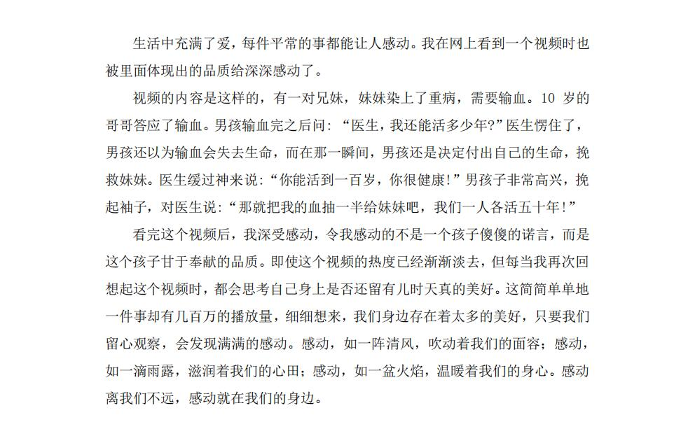 巴金曾说过:“温暖可以使人快乐。”温暖是飘飘洒洒的春雨;温暖是写在脸上的笑影;温暖是义无反顾的响应;温暖是一丝不苟的配合。学习、科研、吃饭、睡觉,日复一日乏味的生活使我们的感情逐渐钝化,当我们试图寻找生活中的温暖,其实温暖就在蓦然回首间。打破尘劳关锁,重拾记忆的碎片,就会发现,温暖是云销雨霁后透出的霞光,是那白鹿青崖间的潇潇暮雨,是寻常巷陌的青石板、烟火气,温暖只轻轻拨动你的心弦,那荡起的涟漪便久久挥之不去,温暖就在你我身边。