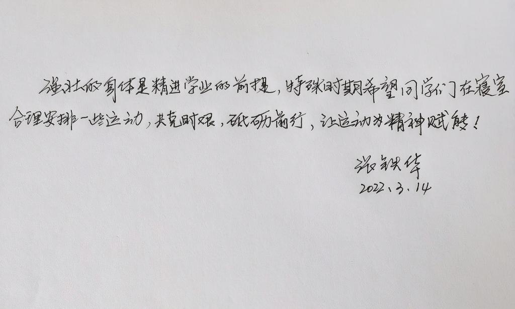 院长张铁华教授对同学们说的:“强壮的身体是精进学业的前提,特殊时期希望同学们在寝室安排合理运动,共克时艰,砥砺前行,让运动为精神赋能!”运动时,大家可以全身心投入其中,激活大脑神经,提升身体机能,进而增加“续航时间”,提升学习的专注力和效率。运动健身不仅增强人的体格、提升身体机能,也能磨练人的意志、锤炼人的精神,增强战胜疫情的信心。