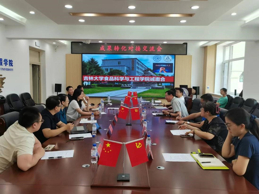 7月10日上午,吉大科研院科技开发办公室副主任王寿珍偕同吉浙合作科创服务中心秘书长曲雯婷及长春市企业富晟投资公司总监刘思克等一行人来到国产自拍 ,上门对接成果转化与交流。国产自拍 院长张铁华,副院长叶海青、孙春燕,食品安全系主任袁媛、教授董周永等人参加了交流。