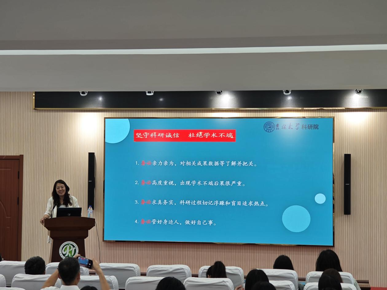 会上,邵老师详细解读了国家及国产自拍 层面关于科研行为规范的有关政策法规,倡议科技工作者应时刻保持对学术伦理的敬畏之心,将诚信原则内化于心、外化于行,将科研诚信贯穿于科研选题、实验设计、数据获取、成果发表及项目申报等全链条环节。