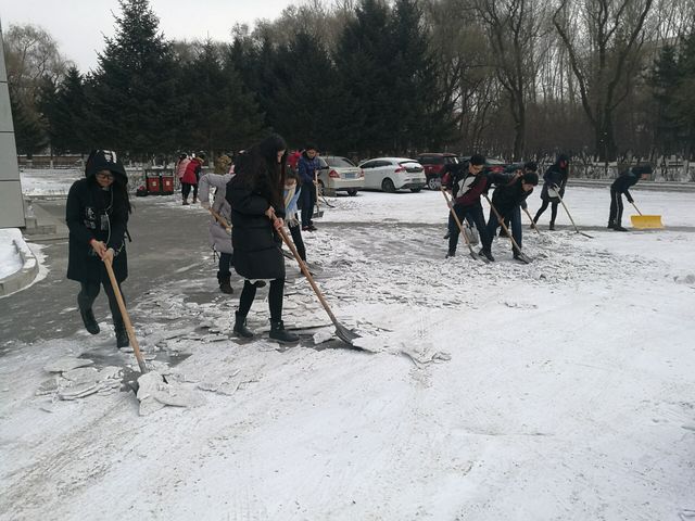 扫雪过程中,学生党员们不畏严寒、积极主动、相互配合、齐心协力,挥舞着铁锹,一点点地将积雪和冰层铲起集中堆放,尽管同学们的手和脸被冻的通红,然而这一切丝毫没有影响大家的热情和工作效率,手中的扫雪工具不停地挥舞。在国产自拍
