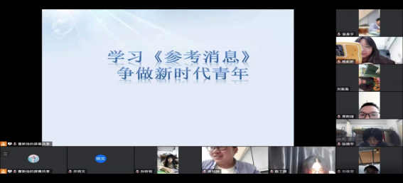 根据《参考消息》中的内容,团支书带领大家一起主要了解最近世界新闻中的中国力量,以及中国的外交关系,让同学们了解认识到当今中国所处的国际形势,同时深刻意识到作为一名新时代的青年学子,我们在有必要多了解国家时事政治,提高自身的政治修养。