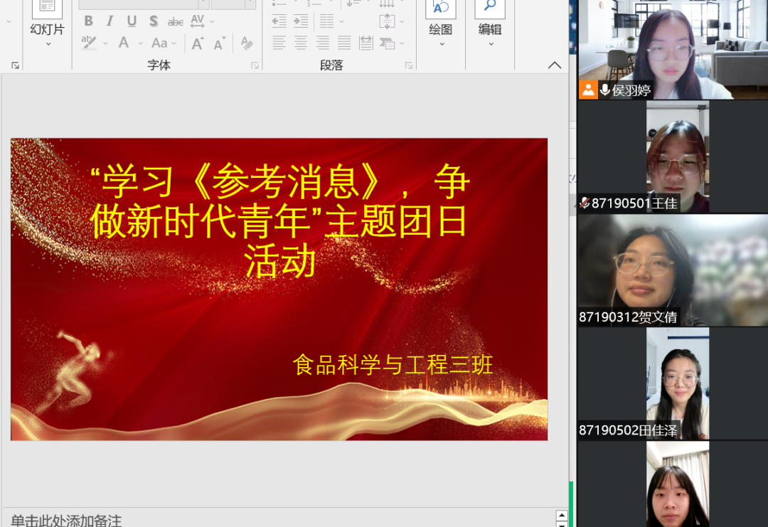 全班同学在团支书的带领下共同学习《参考消息》系列内容,大家在本次活动中受益匪浅。通过这次活动,拓宽了同学们的国际视野,加强了对社会热点问题的分析判断能力。有利于大家自觉在党的旗帜下找到自身发展的方向和坐标,争做新时代的优秀青年,为国产自拍