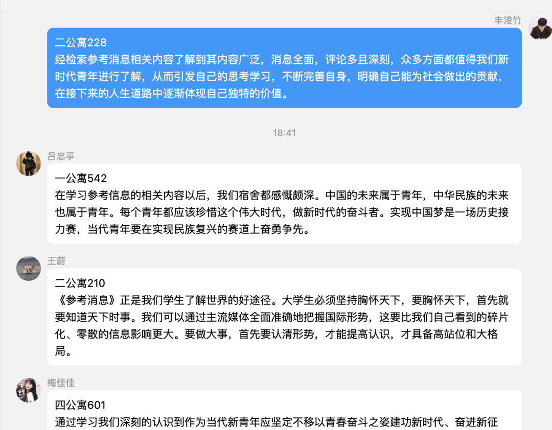 本次活动,团支书带领大家学习并讨论了有关《参考消息》的相关内容。同学们认真学习,热烈讨论,在此过程中受益匪浅。随后,以寝室为单位纷纷发表大家的意见想法,进行分享交流。同学们积极表达了作为新时代青年的责任与担当,更加明确了自己的志向,努力在最蓬勃的年华彰显最大的生命力。
