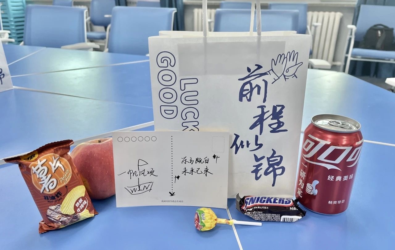 精心准备的每一份礼物,都蕴含着对考研学子的深情与厚望,寄托着美好的祝愿。其中,可乐更是特别定制,瓶身“一研为定”四个大字,成为这份礼物中亮眼而独特的存在,激励着考研学子勇往直前,奔赴梦想之约。贺卡上的手写的文字情真意切,满是对同学们的关怀与鼓励,承载着温暖的力量。李超书记和郝慧老师对学子们展现出的精神风貌给予了充分的肯定和由衷的表扬,衷心祝愿他们能在考研的战场上凯旋而归,达成自己的理想目标。