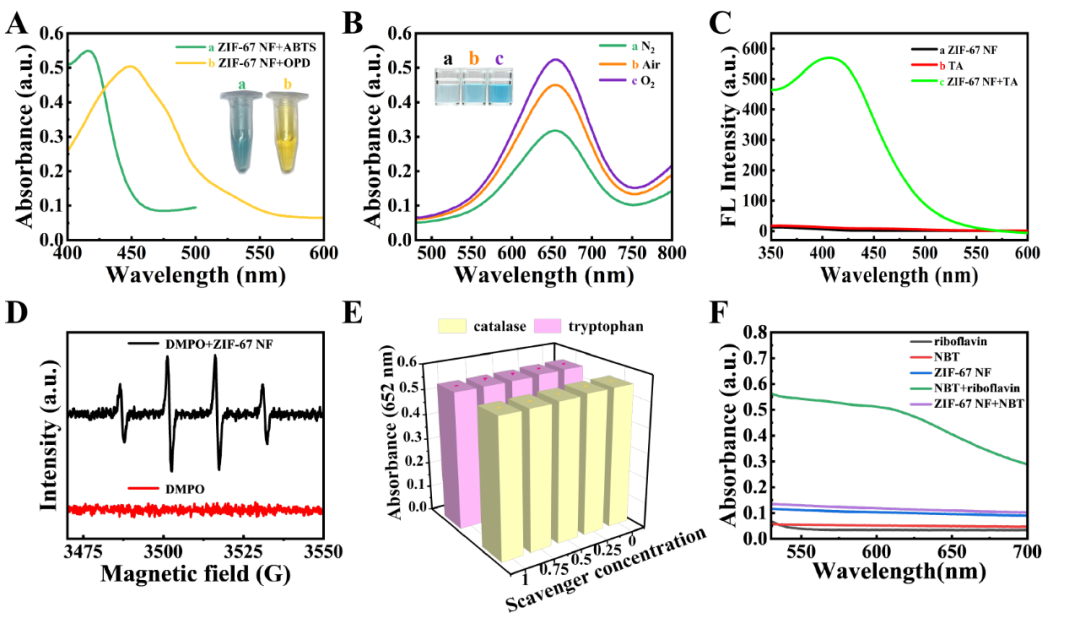 随后,对ZIF-67 NF的类氧化酶活性进行研究,使用其氧化两种常见底物ABTS和OPD进一步证实其活性(图5A)。通过酶活反应条件优化得出pH值、反应时间、反应温度和催化剂用量的最佳值分别为4、15 min、30℃和50 μg/mL。气体对照实验证实ZIF-67 NF的类氧化酶催化氧化是O2依赖性的(图5B)。此外,对ZIF-67 NF类氧化酶活性所涉及的反应中间体进行探究,通过一系列对照表征实验发现羟基自由基(•OH)是反应过程中的关键催化中间体(图5C-F)。不仅如此,该团队发现ZIF-67 NF在20天内、200℃下以及生理环境等条件下均具有良好的稳定性。