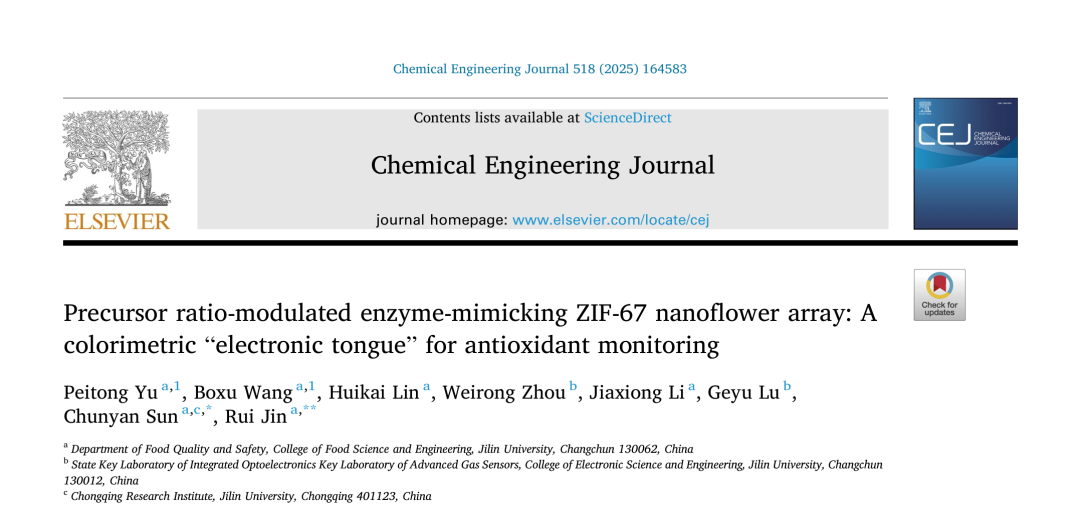 孙春燕、金蕊团队在国际知名学术期刊Chemical Engineering Journal(IF=13.2)发表了题为“Precursor ratio-modulated enzyme-mimicking ZIF-67 nanoflower array: A colorimetric “electronic tongue” for antioxidant monitoring”的研究论文(//doi.org/10.1016/j.cej.2025.164583)。硕士毕业生于沛桐和在读硕士生王博旭为共同第一作者,孙春燕教授和金蕊讲师为共同通讯作者。