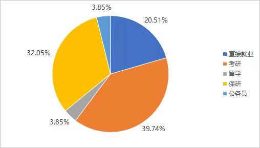 • 升学人数及占比毕业生去向主要集中在升学,升学率总体达75.64%,国内升学占比71.79%,留学占比3.85%。20.51 %的本科生选择了直接就业。