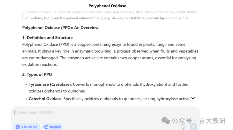 AI 工具如 DeepL、Grammarly、Deepseek 等,可实现专业术语的动态语义解析,结合论文上下文生成精准释义。在我的“食品质量与安全专业英语”课堂中,学生借助 AI 工具后,文献阅读效率提升50%以上。部分学生此前从未完整阅读过英文文献,如今借助 AI 工具不仅能独立阅读多篇英文文章,还能完成老师布置的英文综述任务。以某论文中关于 “Polyphenol Oxidase(多酚氧化酶)” 的内容为例,学生在查阅单词时,AI 工具不仅能快速解释 “polyphenol oxidase(多酚氧化酶)” 等专业术语,还能关联该酶在食品保鲜领域的应用案例,帮助学生深入理解论文内容,有效消除了语言壁垒对学术理解的干扰。