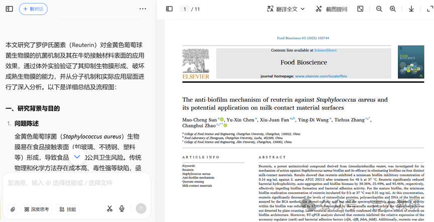 通过自然语言处理技术,AI 能够自动生成论文摘要,提炼核心结论、实验方法等关键信息。以一篇探讨 “罗伊氏菌素抗菌机制” 的研究论文为例,AI 可在数秒内提取以下关键内容:研究背景与目的:明确抗菌研究的意义(如食品防腐需求)及抗菌效果的目标;实验方法:梳理细菌最小抑制浓度(MIC)测定、电镜观察等技术手段;主要结论:揭示罗伊氏菌素在食品接触材料中的应用潜力。此外,AI 还能可视化呈现文章框架(如引言 - 方法 - 结果 - 讨论结构),帮助学生快速把握研究脉络,甚至为后续实验设计提供方法论启发。