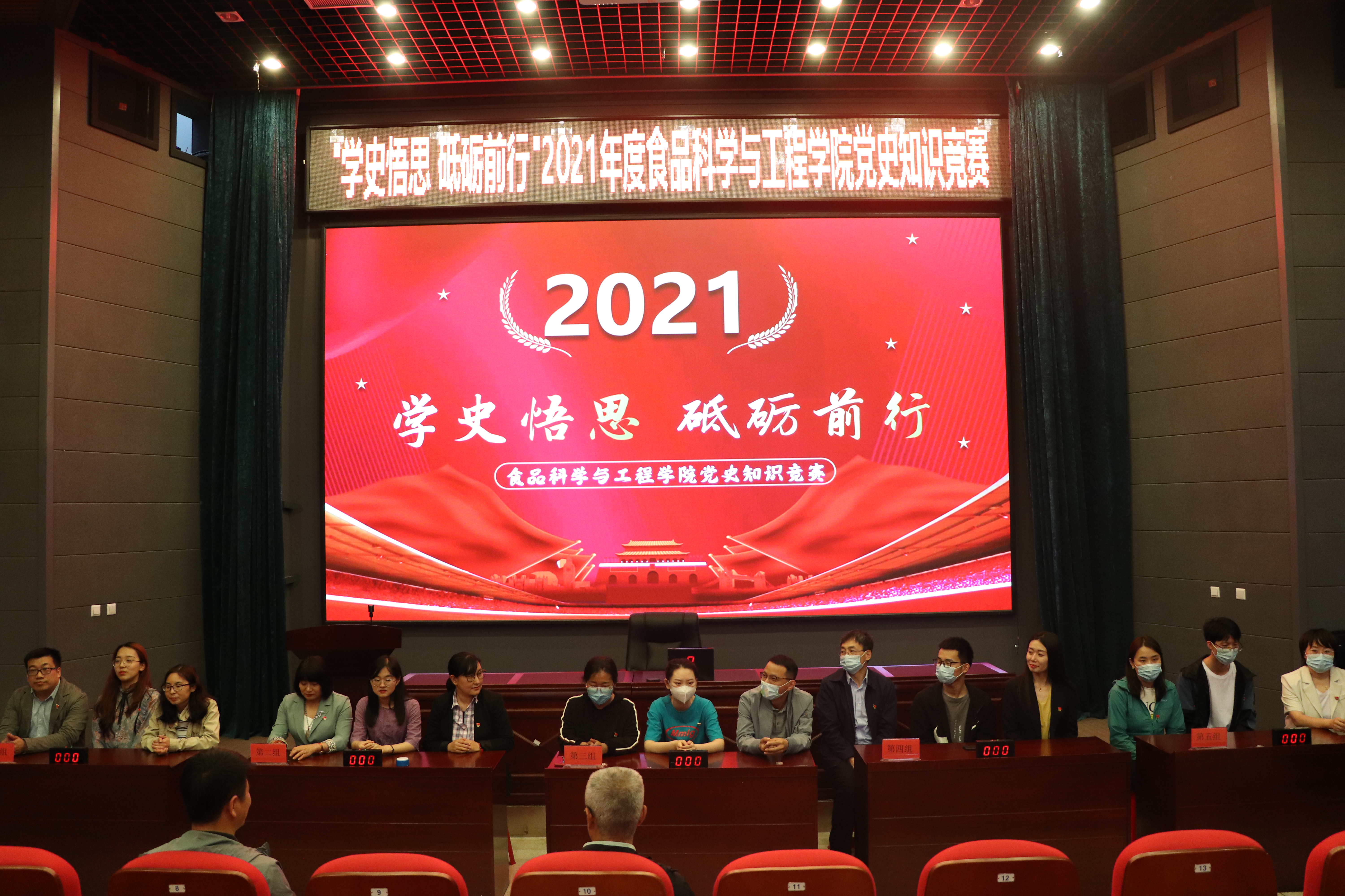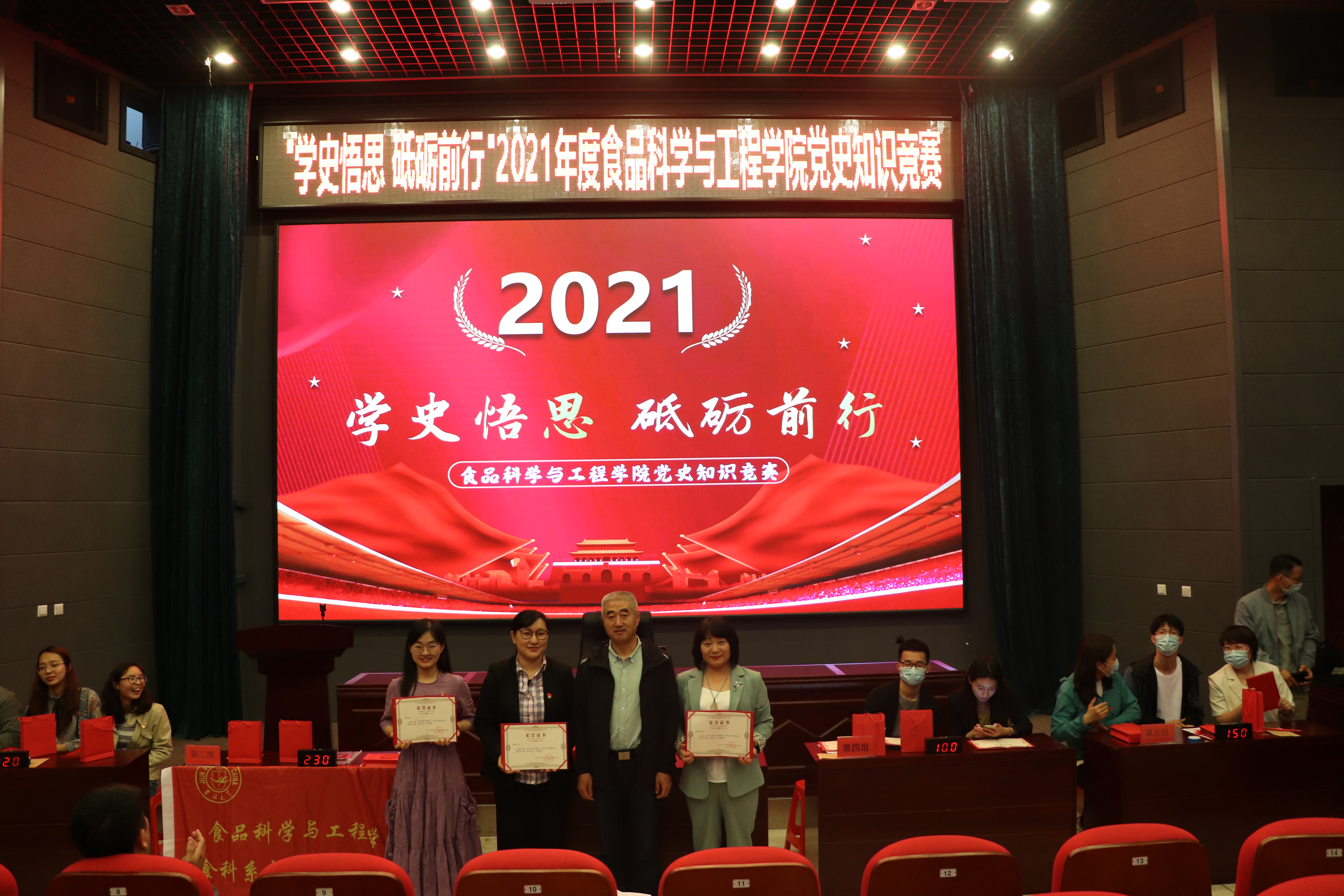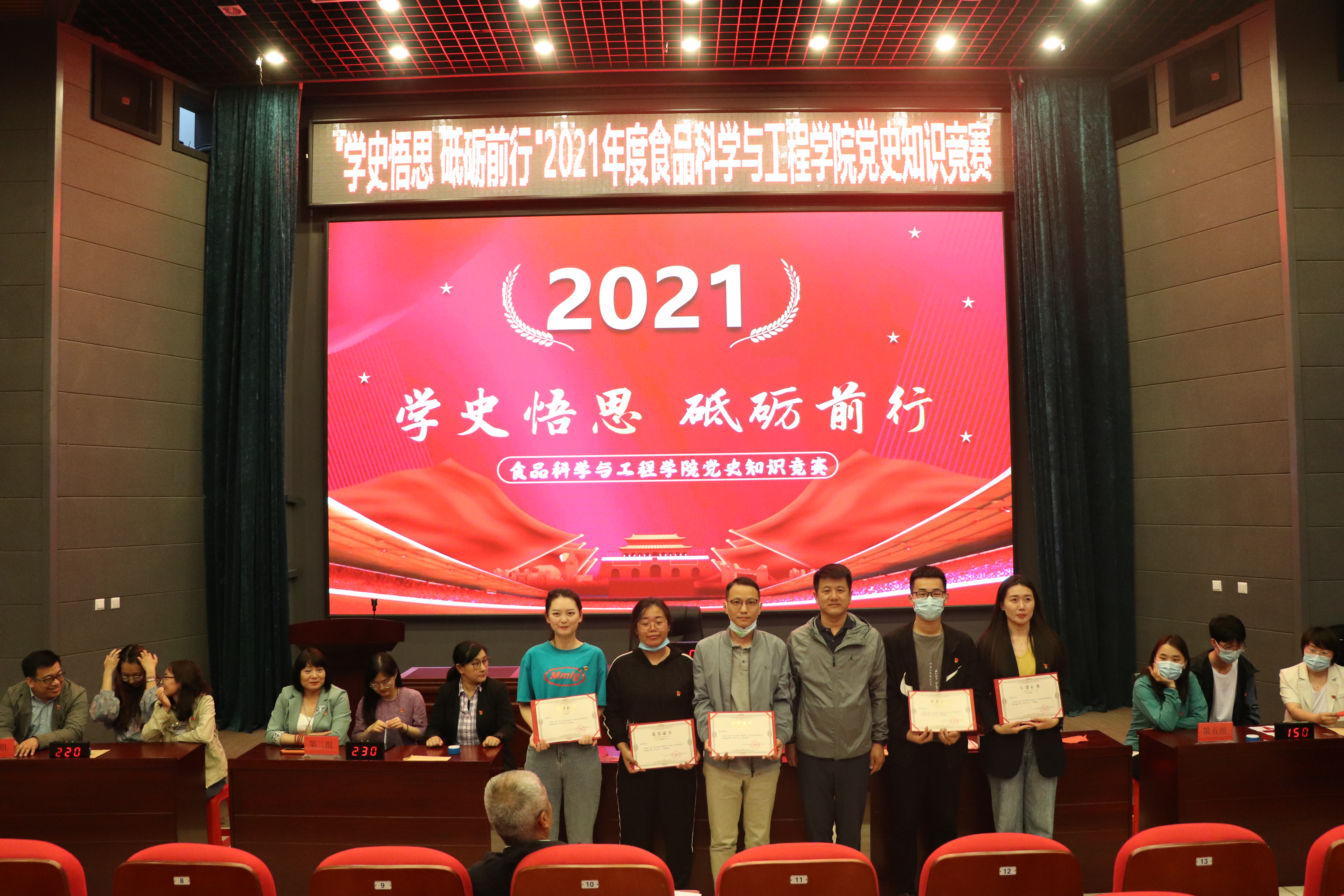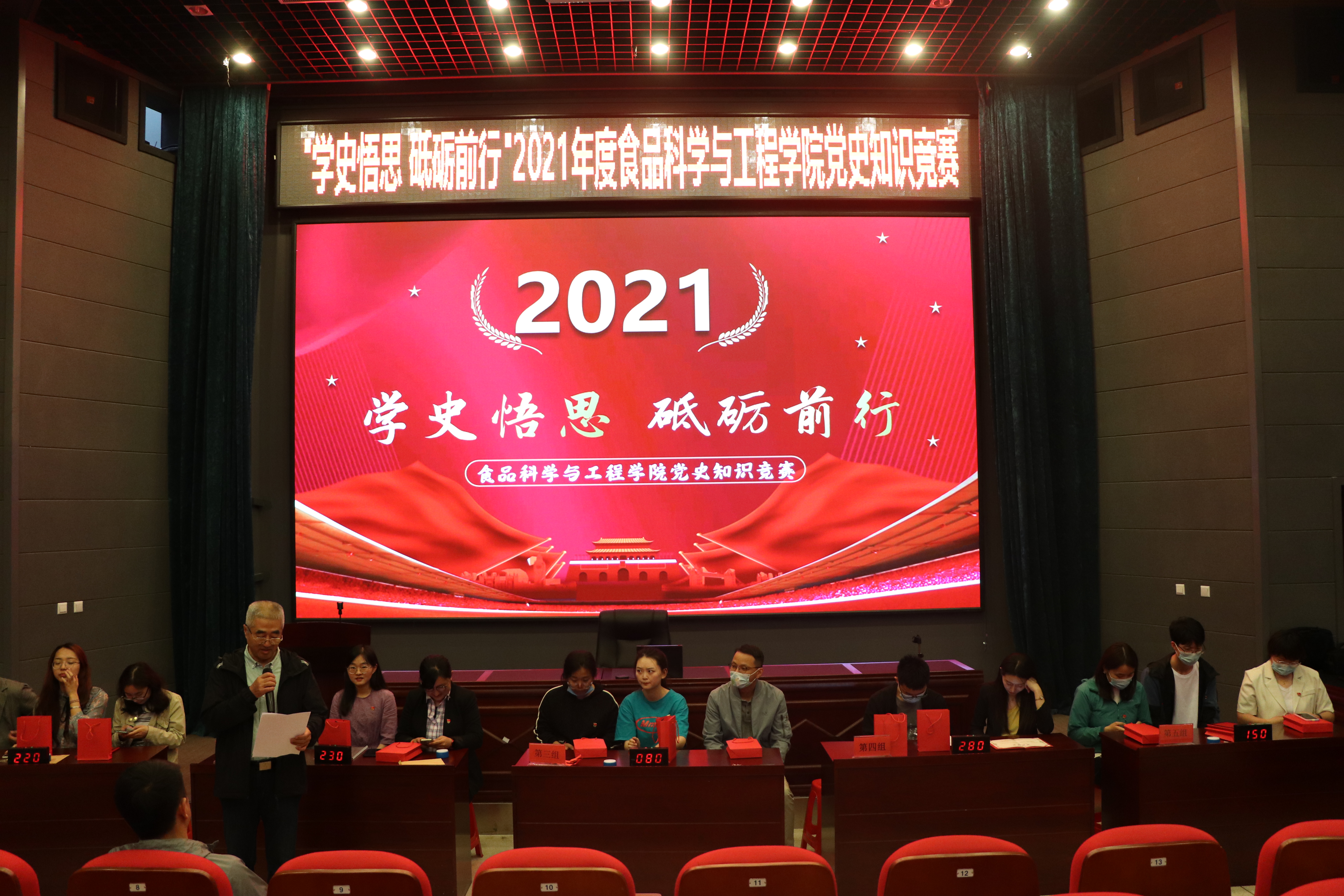师生党员联合组成五支代表队参赛,知识竞赛有必答题、抢答题、风险题等环节,涵盖《中国共产党章程》《党的十九大报告》、党建知识应知应会100题等党史相关内容。主持人宣布竞赛开始后,全体师生党员齐唱《中华人民共和国国歌》,比赛帷幕就此拉开。比赛中,选手们精神饱满,积极踊跃,沉着应答,展现出丰富的党史知识储备。在抢答题环节,各参赛队选手争分夺秒,精彩迭出,赢得了一阵阵热烈的掌声。比赛现场气氛热烈、紧张有序、扣人心弦,经过激烈角逐,食品科学与工程系第二教师党支部代表队荣获一等奖,食品科学与工程系第一教师党支部和实验教学中心党支部代表队荣获二等奖,食品质量与安全系教师党支部和机关党支部代表队荣获三等奖。