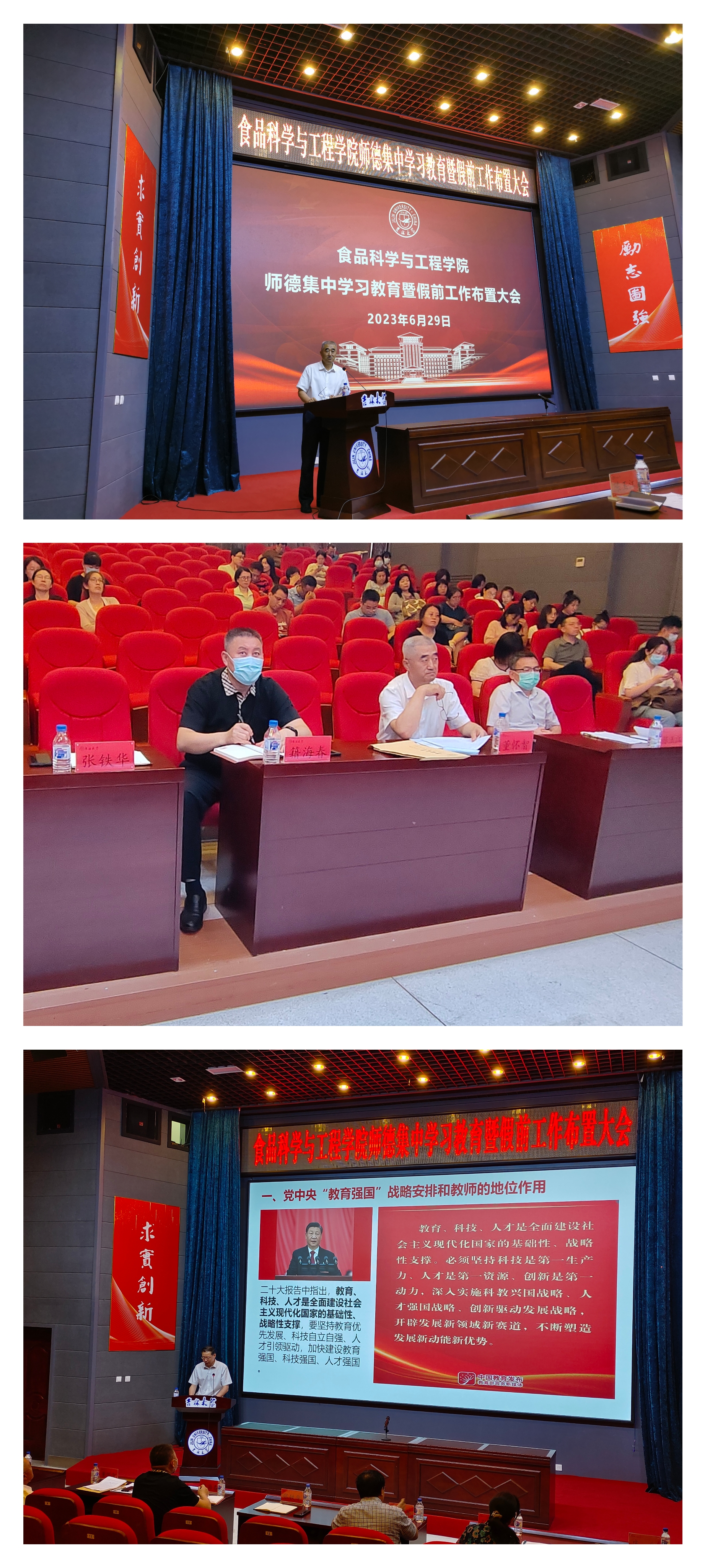 为深入学习贯彻习近平新时代中国特色社会主义思想,贯彻学习习近平总书记关于教育的重要论述和指示批示精神,坚决落实师德师风第一标准,引导广大教职工牢固树立“以德立身、以德立学、以德施教”教育理念,争做“四有”好老师,根据校党委教师工作部《关于在全校开展师德集中学习教育的通知》(校教师字〔2023〕12号)要求,6月29日下午,国产自拍 召开师德集中学习教育暨假前工作布置大会,国产自拍 主题教育第十二巡回指导组副组长、国产自拍 党建工作联络员籍海春同志列席指导。国产自拍 全体教职工参加了本次大会,会议由国产自拍 党委书记董怀智主持。